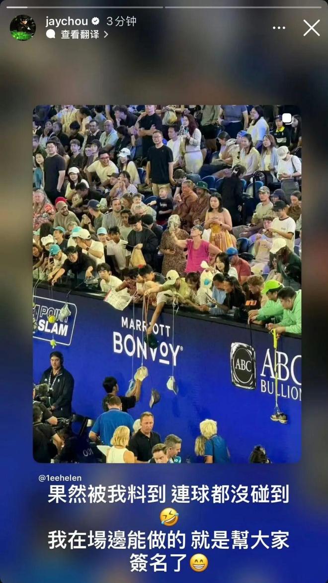 官方慢放更是 “伤口撒盐”,周董和网球擦肩而过的瞬间,像极了哪首周氏情歌? 是 “输球来得太快就像龙卷风”,还是 “我还在等待,你是错过的网球”? 不过周董心态超稳,后面在场边给热情的歌迷朋友签了名,并且打趣道:“以后除了练球,还要练剪刀石头布,赢的选发球。”