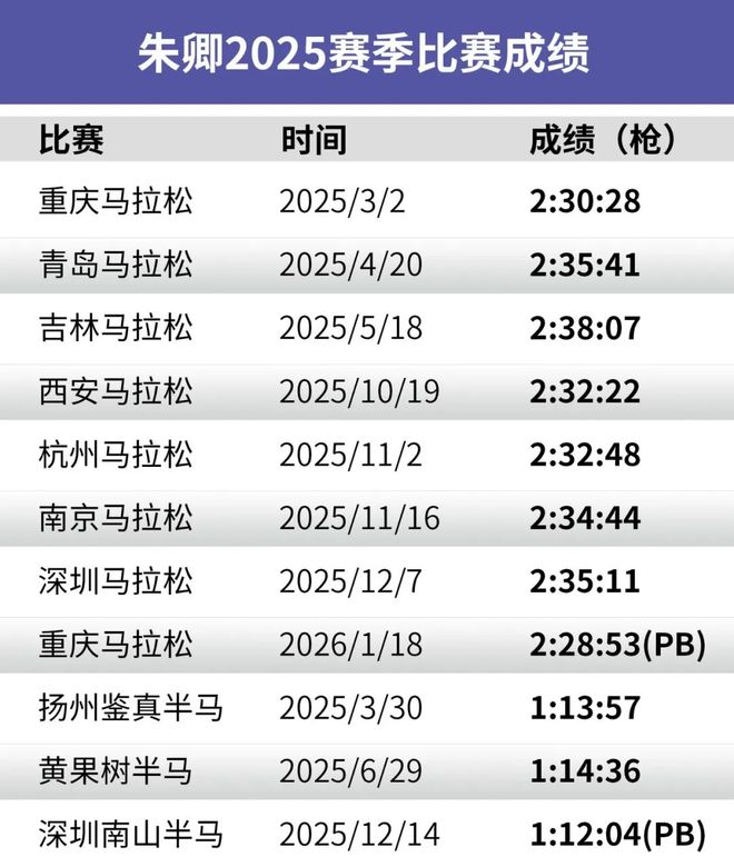 朱卿在南山半马PB 兴奋地挥起了拳头 因为最后一个南半绝望坡,我一步都没想收,我说先干上去再说,然后干上去之后,下坡也没缓着下,直接一个劲儿往前冲,最后一公里了,再冲一下,到终点72分04 。但凡我当时眼睛没糊,我可能还会再往前冲一下,眼睛被汗水遮住了,朦朦胧胧,有点近视的感觉,看不清那个数字了。 Q南山半马的PB带给你什么? A那次PB是我去年下半年跑的最痛快的一次。它的意义在于,夏天跑了那么多间歇,速度终于此刻展示了,哪怕上周跑了个全马,也不影响我半马PB。这个给了我敢往前冲加速的底气,半马成绩跟全马成绩都是匹配的,你半马提了之后,其实全马更好提一点,也更好预测一点。 Q今天跑进228 ,给了你什么样的一个眼界或者是新的认知? A第一反应——以后比赛策略还是得稳住,不能加太急,以后比赛慢慢攒经验,不要着急中间突然加速。我们也可能调整一下策略,或下次比赛尝试一下,努力到36或37公里后再加速更保险一点。我希望一场比赛能以比较好体感跑下来,不是到后半程要顶一公里。 Q明天(1月19日)是你的生日,收到这个PB生日礼物很惊喜吧? A太突然太惊喜了,算是最好的生日礼物吧。 Q迈入228门槛后,有没有特别想要的东西? A机会合适的话,想去国外看一看。名次冠军年年换,大家的出发点不一样,我想去看看外面的比赛。另外还是那句话,无伤PB,就这样练着,进步慢一点没关系。跑到哪是哪,不强求。我跟罗源一直说一句话,从南半PB的那一刻就证明一个问题——广东也能练,不存在哪里练不了的问题,只要想跑,只要你想奔跑,一双鞋就够了,哪里都可以跑。 Q你们提到过今年冬训目标是朝着226? A朝着227-226两个数值中间努力,跑重庆之前,我们规划好了这么练,因为水平去年练得七七八八了,没必要再去纠结跑229来证明这个能力了,我说还要接着往前走,基于自己的状况,而不是基于外界对你——一定要破230证明给他们看。 Q接下来注定要比自己打开230更难,自己心态上至少已经准备好了么? A我的心态早就准备好了。广东是最舒服的冬天,我想把握好眼下这段时间。因为有过夏训的体验,我很珍惜冬天的这段时间。这也是之前我跟罗源为什么一直纠结,要不要跑重庆的原因。因为跑重庆意味着冬训又少了两周,跑完比赛最少调整两周,如果不出来比赛,那这一个月都在训练,相当于冬训了。