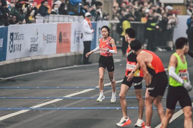 A丁姐跑下来就一个字,稳,一看就感觉比赛经验丰富,不急于前段一时的快或途中的一时快,先稳住自己,把设定的目标完成,再去往前加。感觉就是很稳。30K左右我的表显示配速是328~324区间,我自己看可能是实时数据,抬表一瞬间可能是326、325,但是罗源跟我说看视频我已经加到320了,我已经不知道我跑的到底是什么配速,然后我直到我追上刘敏那一刻,我就觉得坏了,加得太快了。 Q冲线时是不是很放松了? A没有,没有,那刻还没有松。我其实越到最后冲刺的时候,我神经其实越是绷着的。 最后一公里多,重马赛道氛围特别好,两边都有人,他们的声音完全盖住了你身后的声音,只能听到两边的欢呼。我跟自己说一步都不要放。就是很有可能后面的人一下子一个侧身位就把你绝杀了,我就这么一直提着那根神经,万一旁边突然闪出来一个人怎么办?一定要咬住,我一直跟自己说,不要放,不要放。 看到脚下的计时毯,跨过去之后我的心才放下来。 Q冲过终点,双手撑着腿四处张望的那一刻,是怎样的心情? A我没想到我会是第一,哈哈哈,就是比起跑出PB的成绩,我完全没有想到我会拿国内第一。我们赛前预测,刘敏跟丁姐她们俩估计会是第一,因为丁姐跑完广州之后她就再也没有出来比赛,一直在系统地恢复,体能储备应该也七七八八了。然后刘敏的PB水平也很高,速度能力又好。基本上我说她们俩可能会一起跑,我争取保三争个二。